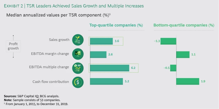 Strong yet profitable sales growth and changes in valuation multiples were key factors distinguishing leaders from laggards, although dividend payouts were an important driver of good TSR performance across our company sample. (See Exhibit 2.) And even though grid companies were the only segment to increase sales as a whole, individual players in other segments grew sales too—and some achieved double-digit growth.