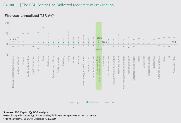 Against the backdrop of healthy global stock markets, European and North American P&U companies delivered a median annual TSR (share price appreciation plus dividends) of 10.5% for the five years from January 1, 2015, to December 31, 2019, placing the sector in the middle of the 33 industries analyzed in BCG’s 2020 Value Creators Rankings. (See the sidebar “The Components of TSR.”)