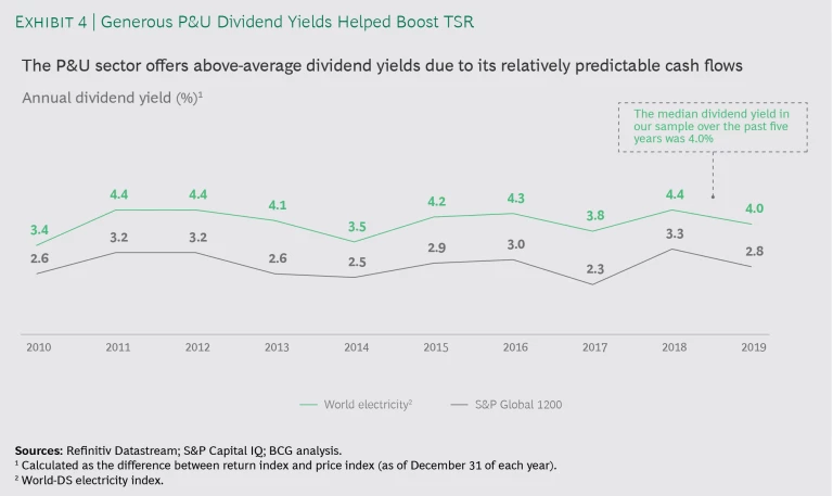 Generous Dividend Yields. For all P&U players, generous dividend yields were a relatively important value driver. While companies in other sectors typically paid dividend yields of 2% to 3%, the companies in our sample consistently offered yields of 4% to 5%, thanks to the predictable nature of their cash flows. (See Exhibit 4.) Combined with a lower risk profile due to regulation, this attracted investors seeking to reduce risk and position their portfolios more defensively.