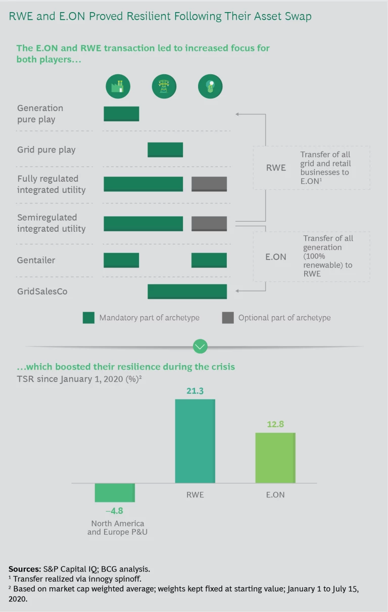 In general, P&U companies were better positioned to weather the effects of the pandemic than other sectors because they entered the crisis with a robust level of liquidity. Nearly all of the companies in our sample had a Standard & Poor’s investment grade rating of BBB– or better. What’s more, as of May, the median current ratio for companies’ last reported 12 months was 1.3, indicating that companies had enough current assets on their balance sheets to meet short-term liabilities without having to borrow. Even so, some leading companies took steps to increase their focus and resilience—and, as a result, the crisis affected them less severely than it did their peers. (See the sidebar “Creating Resilience from a Transformational Deal.”)