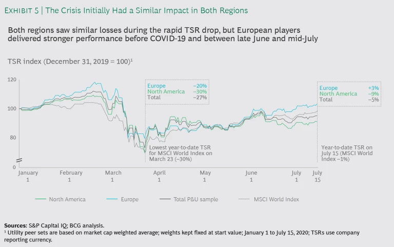 From late March through mid-July, the TSR performance of European P&U players recovered steadily. As a result, the median TSR for these companies from January 1 to July 15 was 3%. The median TSR for North American P&U companies has been more volatile, however, and the impact of COVID-19 on the region’s economy remains more uncertain.