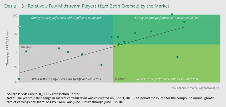 In parallel, midstream players—particularly those in positions of strength—should determine how they and their peers are being valued by capital markets. This will help companies understand whether attractive acquisition candidates are available—or whether they themselves are potential targets. A useful yardstick here is a company’s year-to-date change in market capitalization relative to its three-year earnings per share (EPS) results. We consider companies that have a three-year EPS performance above the midstream median, but valuations that have fallen more than the market, to be oversold.