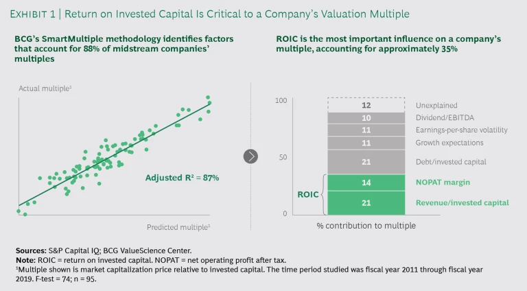 As North American midstream players contemplate their next moves, they should begin by assessing their performance across two dimensions. The first dimension is their historic ability to deliver returns, which we measure using return on invested capital (ROIC). According to BCG’s SmartMultiple methodology, which examines the effects of different operational metrics on multiples, ROIC is a major driver of a company’s valuation multiple and, ultimately, its total shareholder return. (See Exhibit 1.) The second dimension is the amount of leverage employed, with leverage defined as net debt relative to enterprise value. Companies that have performed well on both dimensions will have strategic options their less financially robust peers do not.