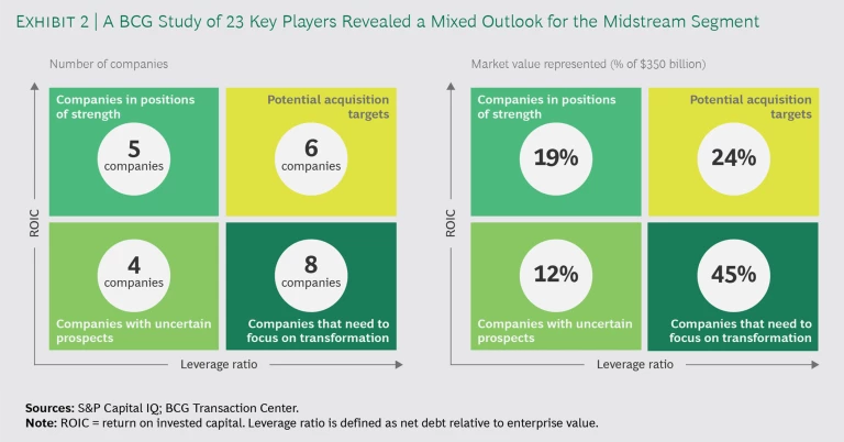 Companies in a relatively weaker financial condition should focus on business transformation aimed at reducing costs, improving capital efficiency, and releasing cash for future growth investments. Businesses in this group consist of two types of players: large firms (including three of the five largest midstream companies) and smaller, more niche-oriented players.