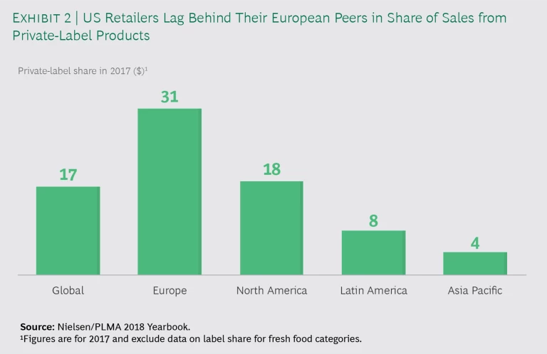 Overall, European grocers generate a larger share of sales from private brands than US grocers do. (See Exhibit 2.) Both European and US players are investing in private brands and will see continued growth in penetration, but we expect the US private-brand share to grow at a higher rate, narrowing the gap between them.