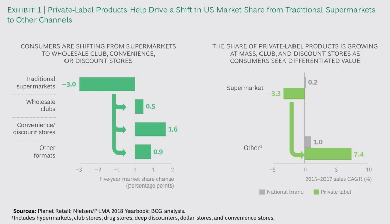 As we look at the overall rise of discount and other formats in the US, the correlation is clear: traditional supermarkets are in decline, and channels that rely more heavily on private brands are gaining share.