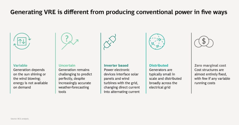 Generating electricity from VRE sources—such as solar photovoltaic systems and onshore and offshore wind turbines—is different from producing power using conventional generators. By definition, VRE depends on the sun shining or the wind blowing. And because VRE is subject to weather conditions, it is uncertain and challenging to predict perfectly. VRE is also distributed (generators are smaller and less centralized), and it relies on inverters (power electronic devices that change the direct current from solar panels or wind turbines into alternating current for electricity grids). For electricity system operators and designers that are integrating VRE sources at scale, these characteristics lead to significant challenges in four areas:
