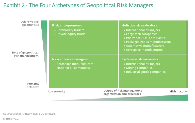 We found that there is no uniform approach to geopolitical risk management. Even leading global companies within the same industry can differ sharply, depending on their corporate cultures and geopolitical risk appetites. We grouped companies into four general archetypes according to the extent to which they recognize and act on opportunities arising from geopolitical shifts—in addition to mitigating the downside risks—and the intensity of focus and sophistication of processes with their organizations. We call these archetypes holistic-risk evaluators, risk entrepreneurs, systemic-risk managers, and nascent-risk managers. (See Exhibit 2.)