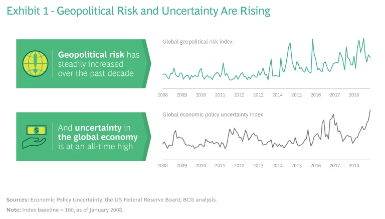 The value of being able to anticipate, synthesize, and harness risk for potential gain has never been greater. Global geopolitical risk and economic uncertainty have increased dramatically over the past decade, according to leading indices. (See Exhibit 1.) What’s more, the COVID-19 pandemic has brought geopolitical risk factors into sharp relief. The ability to proactively navigate turbulence can mean the difference between prospering through a crisis or falling victim.