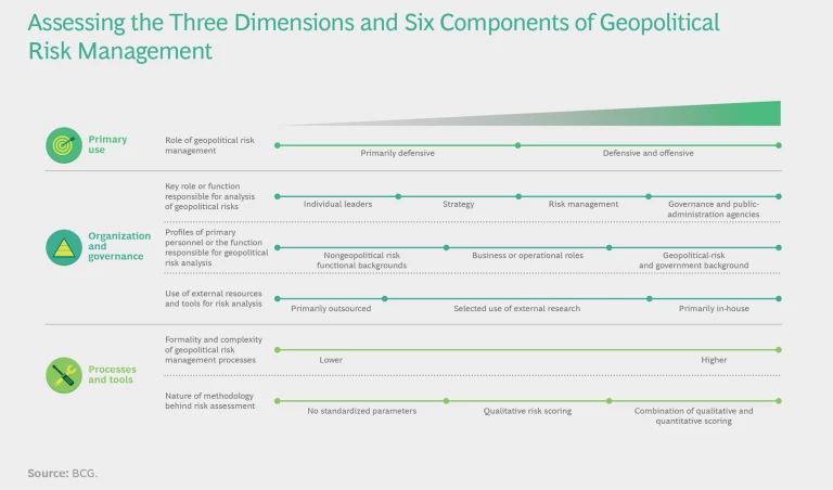 We evaluate three broad dimensions of geopolitical risk management, which incorporate six components, within an organization. (See the exhibit.) The first dimension considers the primary use, and the role, of geopolitical risk management within the organization. The second, organization and government, evaluates the capabilities required to deliver geopolitical risk management. Components of this dimension include the key role or function that is primarily responsible, the profiles of primary personnel or the functions responsible for geopolitical risk analysis, and the use of external resources and tools for geopolitical risk analysis. The third dimension, processes and tools, includes the formality and complexity of geopolitical risk management processes and the methodology used.