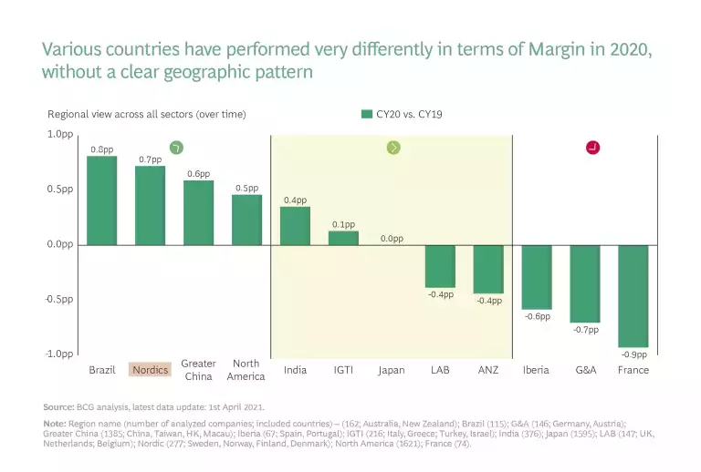 Going to the next level of granularity we have realized that there are significant performance differences not only when comparing various industries or geographies, but even within regions. The Nordics represents an excellent case study of how the four countries in the region dealt with the challenges of the year 2020. For example, at a regional level we see that all four Nordic countries managed to improve their margins in 2020 vs 2019. However, where in Norway that increase was a mere 0.1 pp, Denmark led the way with a 0.7 pp improvement.
