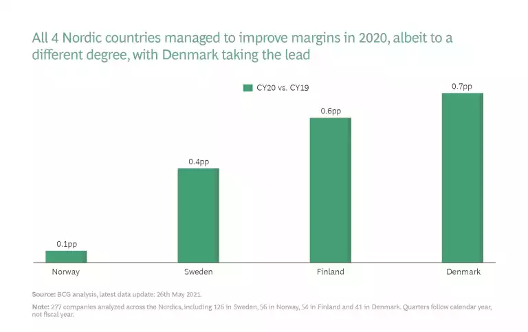 We have studied about 8,000 companies in a proprietary BCG database, representing 15 sectors and covering all major countries and regions. Specifically, we looked at performance over the past three years across a variety of KPIs, including margin, revenue, cost of goods sold (COGS), sales, general and administrative (SG&A) and capex. This sample included almost 300 Nordic companies from Norway, Denmark, Sweden and Finland. That data tells an interesting story about how companies responded to COVID-19.