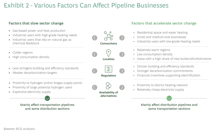 Distribution Networks. Pipelines that take gas from the transportation network and deliver it at lower pressure to residential areas and smaller businesses via a widespread network are likely to see their volumes decline more steeply. Several key factors underlie this probability. The electrification of heating, energy-efficiency measures and policies aimed at curbing the use of natural gas, and a warmer climate will all contribute to reduced demand. For smaller gas consumers, hydrogen is less likely to be an effective substitute for natural gas. In many instances, district heating or individual electricity-based heating offers better long-term economics. Hydrogen-based heating is preferable only in situations where these other approaches are unfeasible, owing to such factors as lack of space or financial resources. Biomethane may offer another alternative utilization of distribution networks, but its use will be limited to areas that are close to sources of sufficient supply, such as from agriculture. The impact of these developments, however, will vary from one player to the next—and even within networks. (See Exhibit 2.)