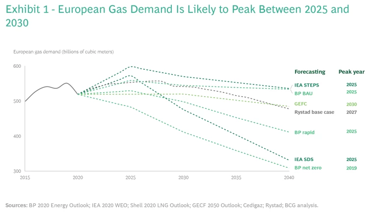 Europe and other regions with a strong commitment to decarbonizing their economies, including Australia and some parts of the US, will lead the way. Most forecasters predict that European gas consumption will peak around 2025, ahead of all other parts of the world. (See Exhibit 1.)
