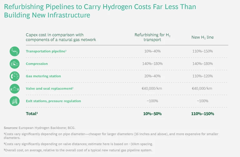 First, transportation pipeline operators will play a crucial role in providing the midstream infrastructure for new low-carbon fuels such as hydrogen. In all cases where companies have a choice, they will find it cheaper to retrofit existing pipelines to carry hydrogen than to build new ones. According to the European Hydrogen Backbone, an initiative set up by 23 gas infrastructure companies, repurposing high-pressure pipelines costs one-third of the one-off investment expense, and 30% to 50% of the full-life cost of an entirely new network. (See “Preparing Gas Networks for Hydrogen.”)