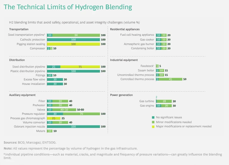 Blending will be an essential first step toward increasing the share of hydrogen in natural gas networks, but it poses some challenges. Considerations of safety, operational limitations, and asset integrity drive current blending limits. (See the exhibit.) Hydrogen is odorless and produces a nearly invisible flame when combusted. It needs just one-tenth of the energy that methane does to ignite, and it can ignite even in very small concentrations when mixed with air. It also dilutes rapidly in air, increasing the risks associated with leakage. Although some of these attributes have advantages, they create safety concerns.