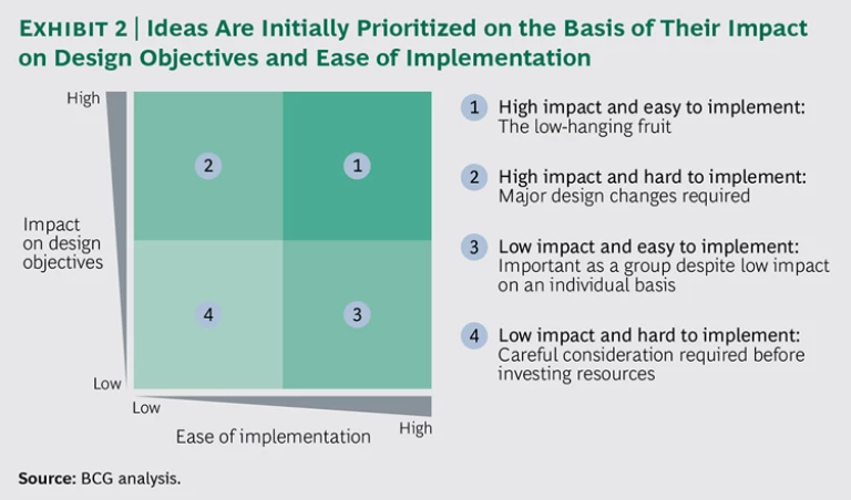 The ideas that emerge from a catalyst event are set out in writing and prioritized according to their potential impact on design objectives and ease of implementation. (See Exhibit 2.) Ease of implementation is based on the degree of engineering change required and its impact on customers and channel partners. This early ranking gives visibility to the best ideas and promotes participants’ engagement in the process.