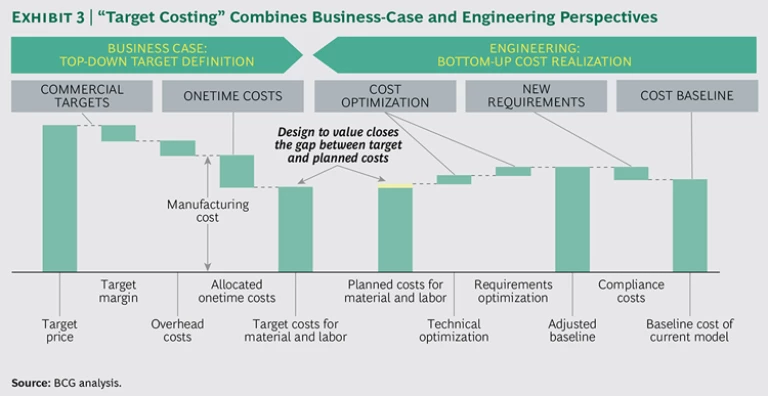 For example, a locomotive manufacturer used “target costing” based on business case requirements as the foundation for its DTV approach. (See Exhibit 3.) The manufacturer faced increasing cost pressures, because it needed to compete with low-cost market entrants and comply with new regulatory requirements.