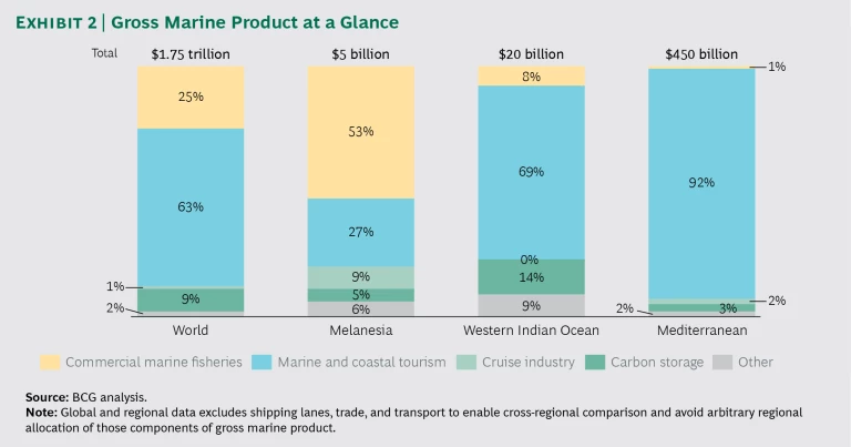 Gross Marine Product. We measured the economic contribution of the oceans on the basis of direct outputs (fishing, aquaculture), services enabled (marine tourism, education), and adjacent benefits (productive coastline, carbon storage). These factors differ significantly among the regions, and therefore an agenda to protect the economic viability of each ocean will differ in focus. (See Exhibit 2.)