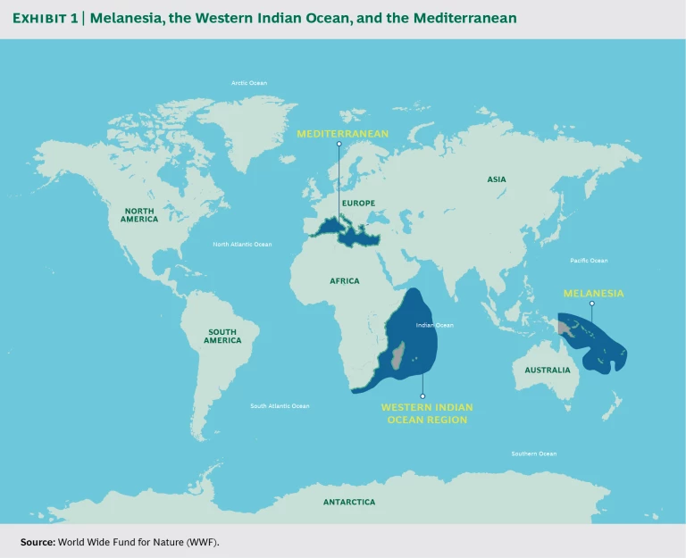 Our analysis and earlier work on the Baltic Sea indicated that the ocean’s health varies widely from one region to another and that the path toward a sustainable future must be tailored to local circumstances. (See Restoring Waters in the Baltic Sea Region: A Strategy for Municipalities and Local Governments to Capture Economic and Environmental Benefits, BCG report, February 2015.) Therefore, as a followup to our earlier reports, we turned our attention (again in association with WWF and the Global Change Institute) to three specific and distinct ocean environments: Melanesia, the Western Indian Ocean, and the Mediterranean. (See Exhibit 1.)