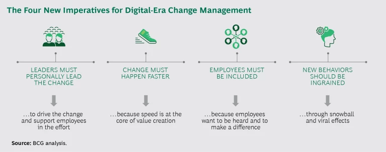 The time-tested fundamentals of change management—practices focusing on leadership, employee engagement, governance, and executional rigor—remain relevant and powerful. But they are not enough. We’ve identified four new imperatives for change management in the digital era: leaders must personally lead and commit to the change, change must happen faster, employees must be included (as active agents), and new behaviors should be ingrained in the workforce. (See the exhibit.) To satisfy these imperatives, companies can exploit some of the very same technologies that are triggering the transformation. Digital tools, with their reach and scalability, unlock opportunities to create powerful, new, and inviting ways for change to take root.