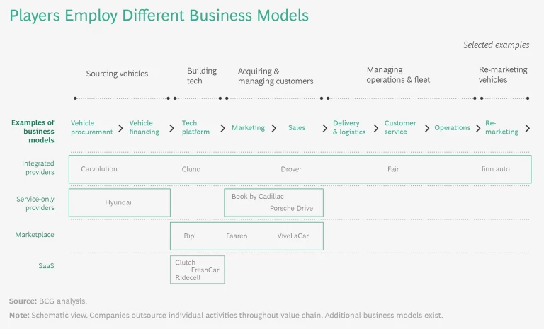 The marketplace provider. With this model, the provider doesn’t offer its own vehicles. Instead, it provides the front-end interactions: marketing, listings, and directing customers to dealers, leasing companies, or others that actually provide the vehicle. In some cases, such as Bipi, it contracts with the customer directly. Its vehicle providers handle operations. With this asset-light model, the provider can piggyback on the infrastructure of its partner-providers, such as LeasePlan and ALD Automotive. It negotiates with the leasing companies, which then handle operations, re-marketing, and other functions. Once the partner-provider relationship is established, the marketplace provider can scale up quickly. The disadvantage of this model is that its adopters are subject to the processes and standards of the vehicle providers they rely on, with limited control over their services.