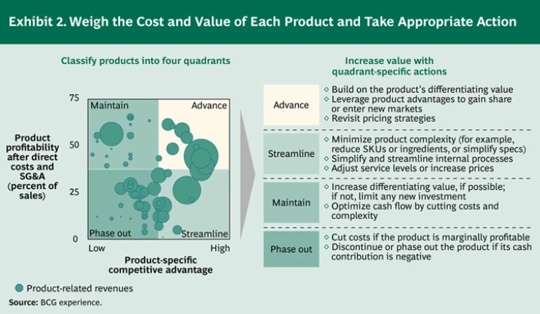 Of course, decisions about portfolio optimization must always be made in the context of strategy. A dispassionate review of the product portfolio can help companies clarify the positioning of their products relative to the competition, pinpoint products with the greatest potential for enhancement, and identify areas where operational complexity can be reduced to increase margins. This approach can also uncover high-cost, low-value products that can be eliminated with very little negative impact—assuming that your premium customers don’t depend on them—while streamlining the portfolio by minimizing the number of products overall.
