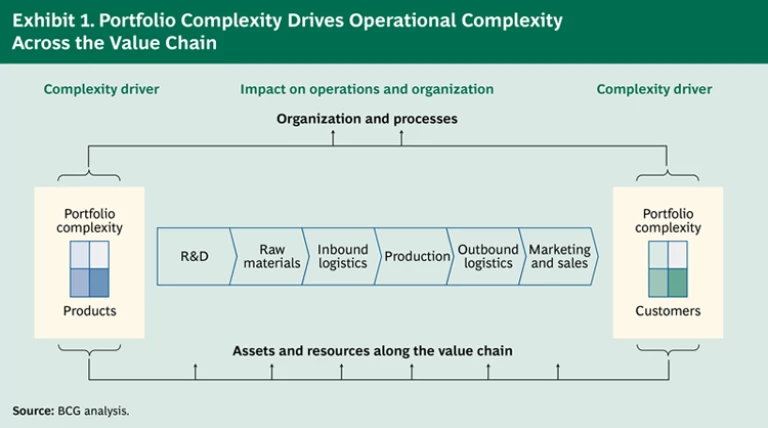 The full impact of product and portfolio complexity on operations is rarely obvious, even though it is felt across the entire value chain. (See Exhibit 1.) It hides in and between functions, departments, and regions, where employees see only slices of the problem. The people in sales, for instance, may see only a complex product portfolio. But plant managers wrestle with the challenges of production planning and scheduling, supply chain managers deal with rising inventories, and finance managers see a growing level of investment in fixed assets.