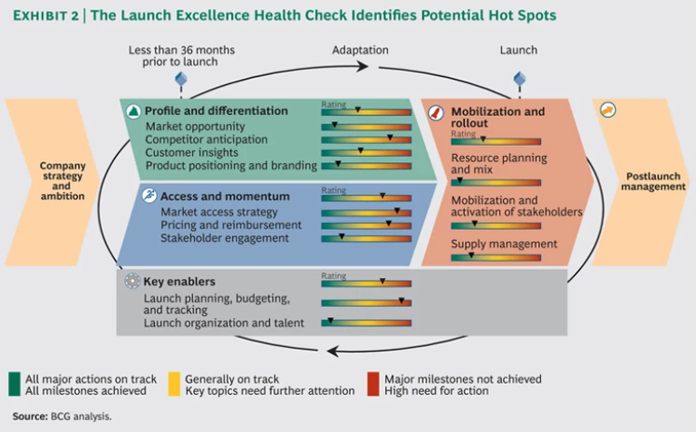 As companies approach a launch, it is common for managers to wonder just how well the teams have executed the myriad steps needed to ensure an effective rollout. Are they really ready? To answer this question, BCG created a Launch Excellence Health Check. Companies can use this tool kit to gather the information necessary to determine where gaps exist in the launch plan and to outline the actions required to address those areas. By using a broad set of tools, including Web surveys and interviews, over a period of four to six weeks, companies can review plans, assess launch teams, query stakeholders, and screen competitors’ moves, collecting the data at global, regional, and local levels. The result is a detailed heat map that highlights key areas for improvement and makes apparent time-critical elements that have been missed. (See Exhibit 2.) All this is then translated into action steps and tracked.