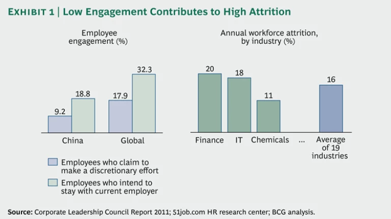 Employee engagement is weak, contributing to high turnover. Various studies of employee engagement in recent years—typically, measuring self-reported discretionary efforts and intent to stay with an employer—find the level of engagement among Chinese employees to be roughly half the global average.
