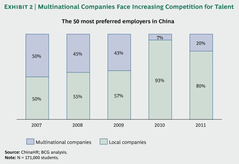 Multinationals face stiff competition from local companies. Multinationals are losing ground to local companies: 80 percent of the 50 most preferred employers in 2011 are Chinese companies, up from just 50 percent in 2007.