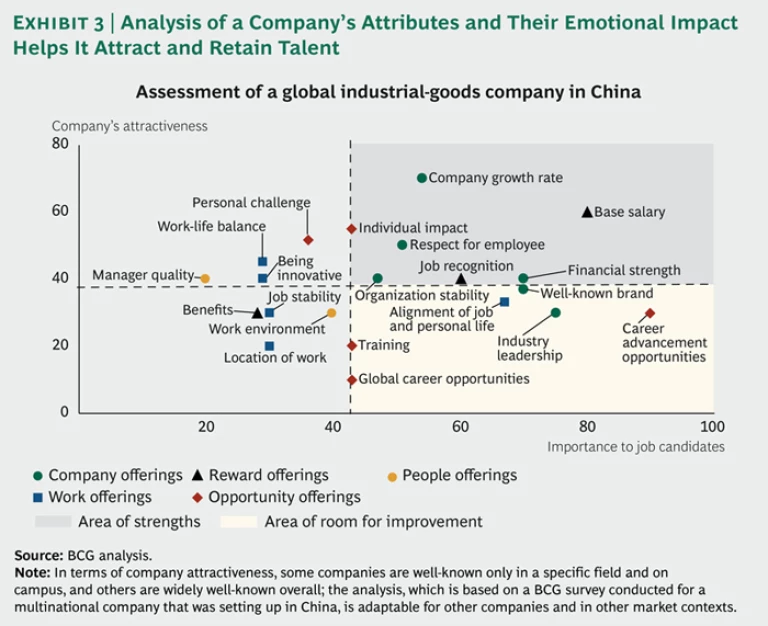 Because multinationals may be unaware of how they are perceived by Chinese employees and potential recruits, it pays to start with an outside-in survey that explores current and desired attributes of the company. Arraying the attributes on a matrix of attractiveness versus importance identifies the most important strong and weak attributes. These attributes can be further classified by their nature as company, reward, people, work, or opportunity offerings. (See Exhibit 3.)
