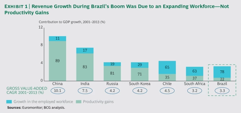 The boom of the previous decade obscured structural flaws in the Brazilian growth story. In emerging markets such as China, India, and South Korea, rising productivity has been the chief driver of GDP growth. In the case of Brazil, however, productivity grew by a meager 1% a year on average from 2001 through 2013, well below the increase in wages over that period. (See Brazil: Confronting the Productivity Challenge, BCG report, January 2013.) Instead, 78% of the nation’s GDP growth from 2001 through 2013 was attributable to increases in the employed workforce. (See Exhibit 1.) These gains were driven by average annual growth in the working-age population of 1.8% and by falling unemployment, which reached a record low of 4.8% in 2014. But Brazil’s population is aging, and annual growth in the workforce through the rest of the decade is projected to drop to 1.4%.