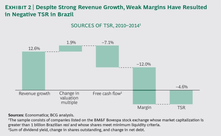 These factors translate into slower growth in most Brazilian industries. That is a considerable problem for many companies operating in Brazil and their shareholders. Our analysis shows that, on average, revenue growth contributed 12 percentage points of the total shareholder return (TSR) generated by companies on São Paulo’s BM&F Bovespa stock exchange from 2010 through 2014. (For an explanation of TSR, see “The Components of TSR.”)