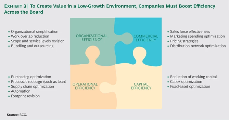 To generate significant, sustainable value for their shareholders over the medium term, companies must become more efficient at every level. They must radically reshape their commercial approach, enabling their staff to spend more time with clients and squeeze more revenues out of flat market. They must make their operations leaner. They must simplify and streamline their organizations. They must create more win-win arrangements in their supply chains. They must ensure that their capital is put to best use.