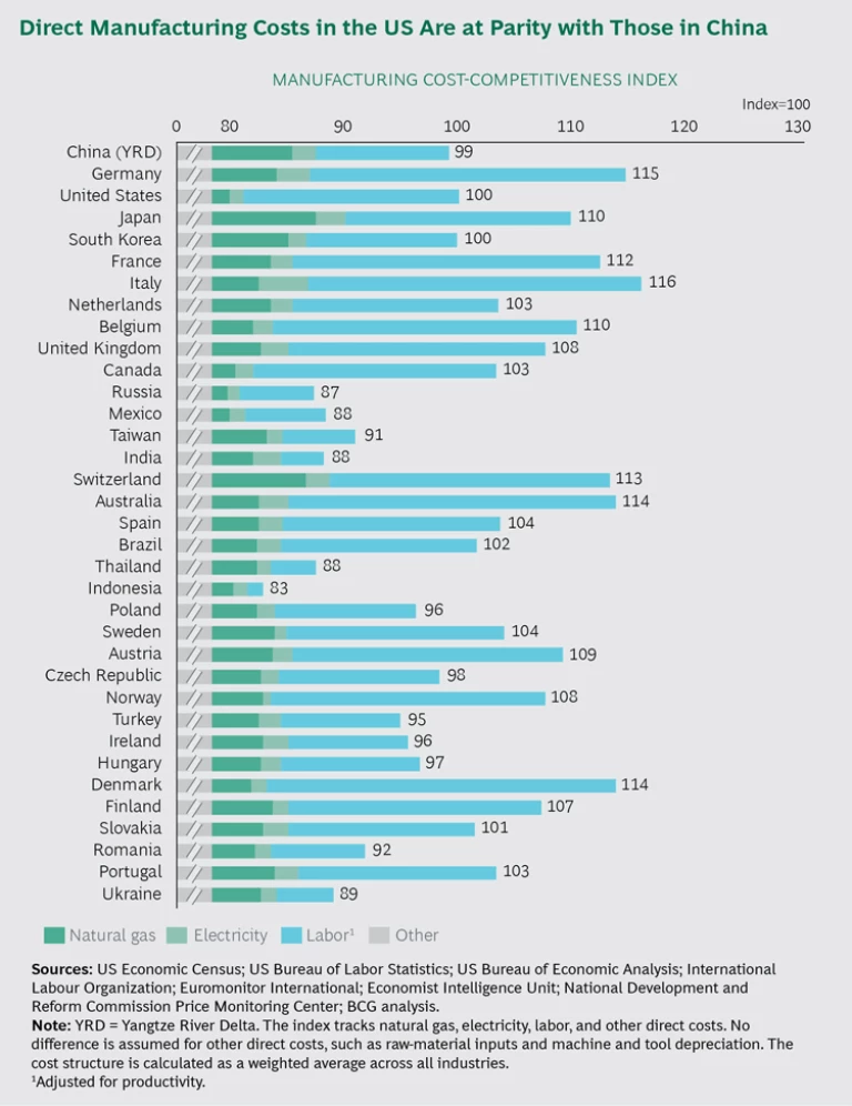 The main reason for this change is economics. As The Boston Consulting Group has documented, the cost competitiveness of US manufacturing has been improving significantly over the past decade, compared with many of its biggest trading partners—most notably China. (See Made in America, Again: Why Manufacturing Will Return to the US, BCG Focus, August 2011, and The Shifting Economics of Global Manufacturing: How Cost Competitiveness Is Changing Worldwide, BCG report, August 2014.)