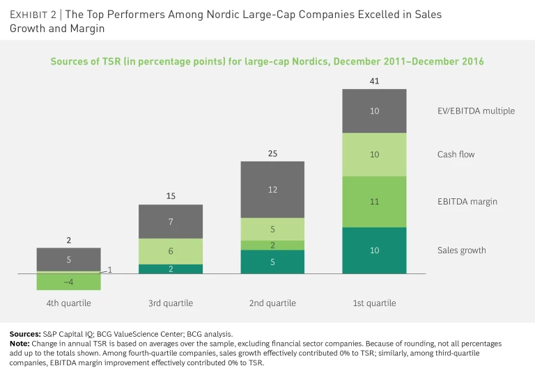 The top-quartile companies achieved a stunning average TSR of 41% during the five-year period—16 percentage points higher than the average TSR for companies in the second quartile, and 39 percentage points higher than the median figure for bottom performers. (See Exhibit 2.) Our analysis shows that strong fundamentals rule: robust top- and bottom-line performance is critical for achieving significant and sustainable value creation. Top-quartile performers distinguished themselves with faster sales growth and the ability to improve their margins. In contrast, companies in the third and fourth quartiles demonstrated little or no improvement on either metric.