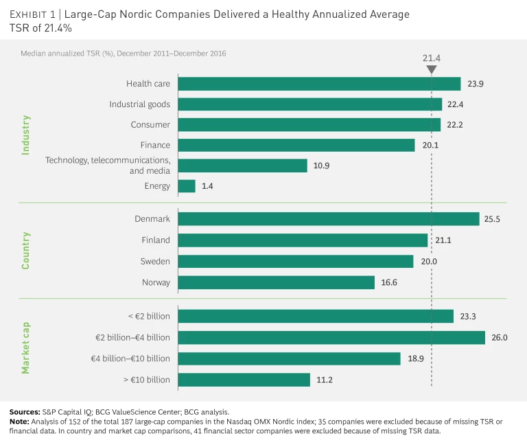Strong performance was fairly consistent across all industries, except technology, telecommunications, and media (TMT) and energy. It was also reasonably consistent throughout the Nordic countries. Denmark’s companies led the pack (with a median TSR of 26%), while Norway lagged (17% median TSR), primarily because of the oil and gas industry’s disproportionate representation in its economy. All but the largest market-capitalized companies—a bracket that is dominated by TMT and energy—achieved impressive TSRs.