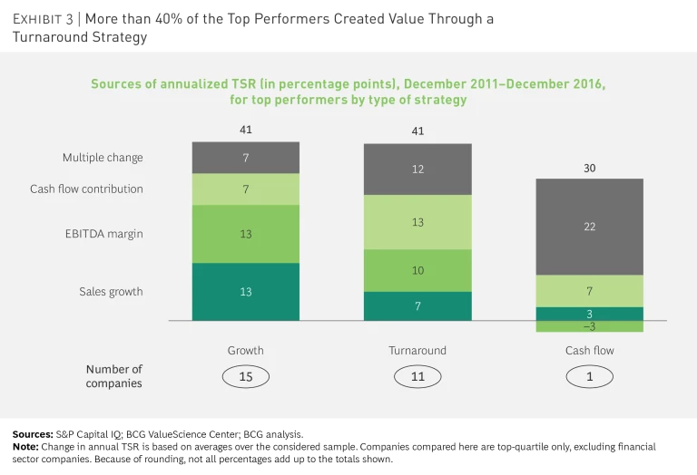 Of the 27 companies in the top quartile, 11 (more than 40%) created value through a turnaround, 15 created value through growth, and 1 depended primarily on cash flow (such as dividends) for its success. (See Exhibit 3.) Both the turnaround companies and the growth companies achieved average annualized long-term TSRs of 41%, while the cash-flow company managed an annualized TSR of 30%.