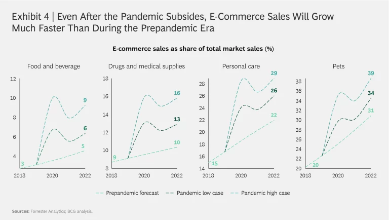 Our analysis of four key consumer categories—food and beverage, drugs and medical supplies, personal care, and pet products—suggests that online sales as a percentage of the total will continue to grow far faster than prepandemic estimates, even after the crisis ends. Sales of food and beverage products online, still just 3% of the total, are likely to make the most gains—a major shift, given the sheer size of the market. But we estimate that even online sales of pet products, already 20% of the market, may grow to as much as 39% over the next two years. (See Exhibit 4.)