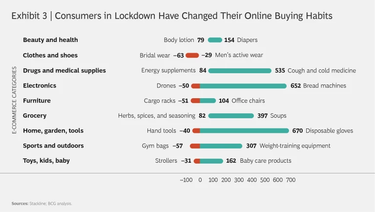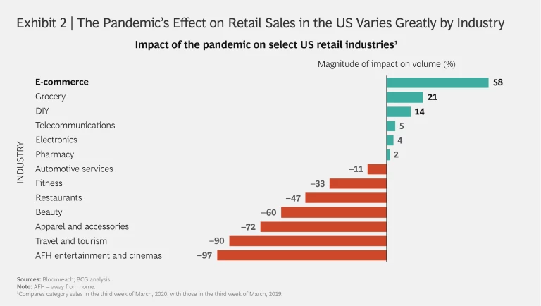 But that’s all changed. The impact of COVID-19 on the global economy has been swift, although it varies considerably from industry to industry. In the US, for example, entertainment outside the home, along with travel and tourism, is currently down by at least 90%, while grocery sales are up by more than 20% and e-commerce by more than 50%. (See Exhibit 2.) As a result, market capitalization for Amazon, the largest e-commerce player by far, has increased by more than 25% since the end of January. And first-quarter 2020 global revenues at Shopify, a Canadian provider of e-commerce services, grew by almost 50% compared with the same period in 2019. In the US, the increase in online shopping has led to booming sales in such categories as groceries, electronics, health care products, and toys, while clothing, sports and outdoor equipment, and other nonessential goods have suffered. (See Exhibit 3.)