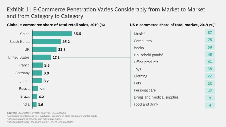 E-commerce had been growing impressively even before the onset of the pandemic. From 2017 to 2019, global growth in e-commerce sales outperformed brick-and-mortar sales by a factor greater than 10, and retail sales online were expected to rise from just 12% in 2017 to $6.5 trillion, or 22% of total retail sales, by 2023. Several major economies have adopted e-commerce with enthusiasm, including China, South Korea, and the UK; but large developing markets, including Brazil, India, and Russia, remain underpenetrated. Even in the US, the world’s largest economy, online sales had not reached 20% of the total before the pandemic, with such major retail categories as personal care, drugs and medical supplies, and food and drink notably lagging. (See Exhibit 1.)