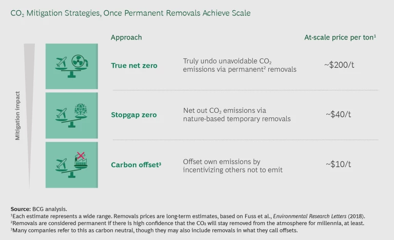The strategy of true net zero aspires beyond the two currently available CO2 mitigation strategies of “carbon offset” and “stopgap zero.” (See the exhibit.) The carbon offset approach entails balancing emissions by incentivizing others not to emit. But the price of such carbon offsets is so low that it encourages some companies to buy their way out of the need to change behavior and cut emissions. Getting to a middle-ground stopgap zero is a more effective mitigation approach, though it is more expensive and relies heavily on nature for temporary removals.