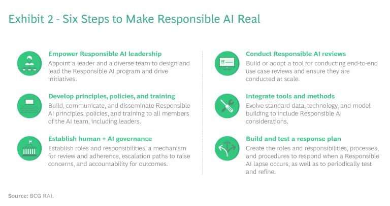 From our engagements with multiple organizations, we have uncovered six basic steps to make Responsible AI real. While they may appear extensive, leaders should remember that they do not require a massive investment to get started. Each step can begin small and evolve and expand over time as an initiative matures. The important thing is that organizations should make progress across each of these steps. (See Exhibit 2.)