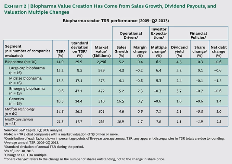 In the aggregate, the 70 biopharma companies that we analyzed generated average annual TSR of 14.9 percent from 2009 through the second quarter of 2013. Of that total, the biggest drivers for the overall sector were changes in the valuation multiple (contributing 6.5 percent), sales growth (contributing 5.2 percent), and dividend yield (contributing 4.5 percent). The remaining three drivers actually reduced TSR during this period. (See Exhibit 2.)
