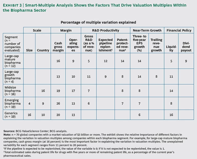 To conduct our smart-multiple analysis, we further divided the group of large-cap biopharma players into two subcategories based on their financial-management strategy and dividend policy: “mature” and “growth” companies. Large-cap mature companies are well-known, established players that pay attractive dividends to maintain investor interest. Examples include AstraZeneca, Eli Lilly, and Pfizer. Large-cap growth companies are those that are growth-oriented and pay little or no dividends. Of the group we analyzed, just four companies fit this profile: Biogen Idec, Celgene, Gilead Sciences, and Novo Nordisk.