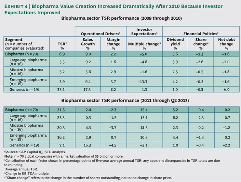 For the first period—from 2009 through 2010—the biopharma sector generated a relatively low average annual TSR of just 6.9 percent. In the second period—from 2011 through the second quarter of 2013—average annual TSR grew to more than 20 percent. The most important factors behind that improved value-creation performance were reducing cost bases, enhancing R&D pipelines, and expanding into emerging markets.