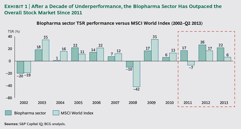 Advances in discovery and development began to pay off; for example, drugs against targets revealed through genome-wide association studies (GWAS)—such as CFTR in cystic fibrosis and PCSK9 in dyslipidemia—began to reach the market. As a result, investors regained their confidence in biopharma companies, and the sector significantly outperformed the MSCI World Index from 2011 through 2013. (See Exhibit 1.)