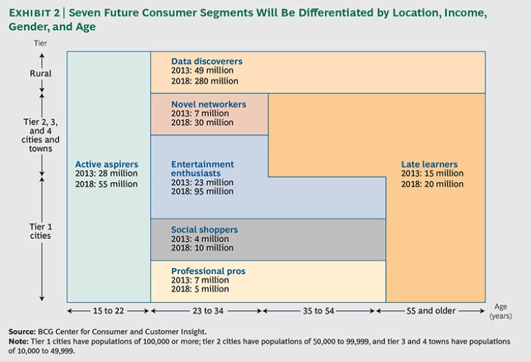 Then there is a huge, seventh segment of predominantly rural consumers coming online. This group—the “data discoverers,” who are new users in semiurban and rural areas and span most age-groups—is set to explode, from 50 million today to some 280 million in 2018. Their fast-growing ranks will propel much of the growth in overall Internet usage. (See Exhibit 2.)