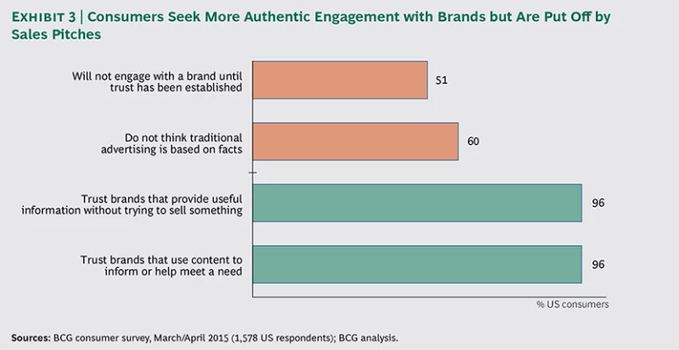 Understanding this trust factor is critical. It’s not that consumers are unwilling to trust communications from brands; in fact, they want to believe them. But they are looking for substantive engagement that provides value to them; sales pitches turn them off. An astounding 96 percent of US consumers say they trust brands that provide useful information without trying to sell them something. A similar percentage say they trust brands that use content to inform them or help them meet a need. (See Exhibit 3.)
